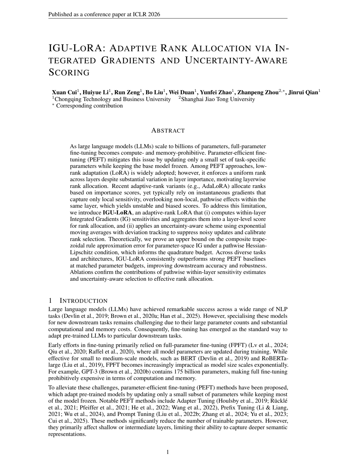 在扎实推进学科专业建设、强化前沿基础研究能力的背景下,我校人工智能学院在大模型微调理论研究方面取得重要突破。近日,由学院大模型理论与应用团队完成的研究论文“IGU-LoRA: Adaptive Rank Allocation via Integrated Gradients and Uncertainty-Aware Scoring”被人工智能与机器学习领域国际顶级会议——国际学习表征大会(ICLR 2026)录用。该成果标志着我校在大模型微调理论领域取得首次原创性突破,彰显出学校在前沿人工智能基础研究方面的国际竞争力。