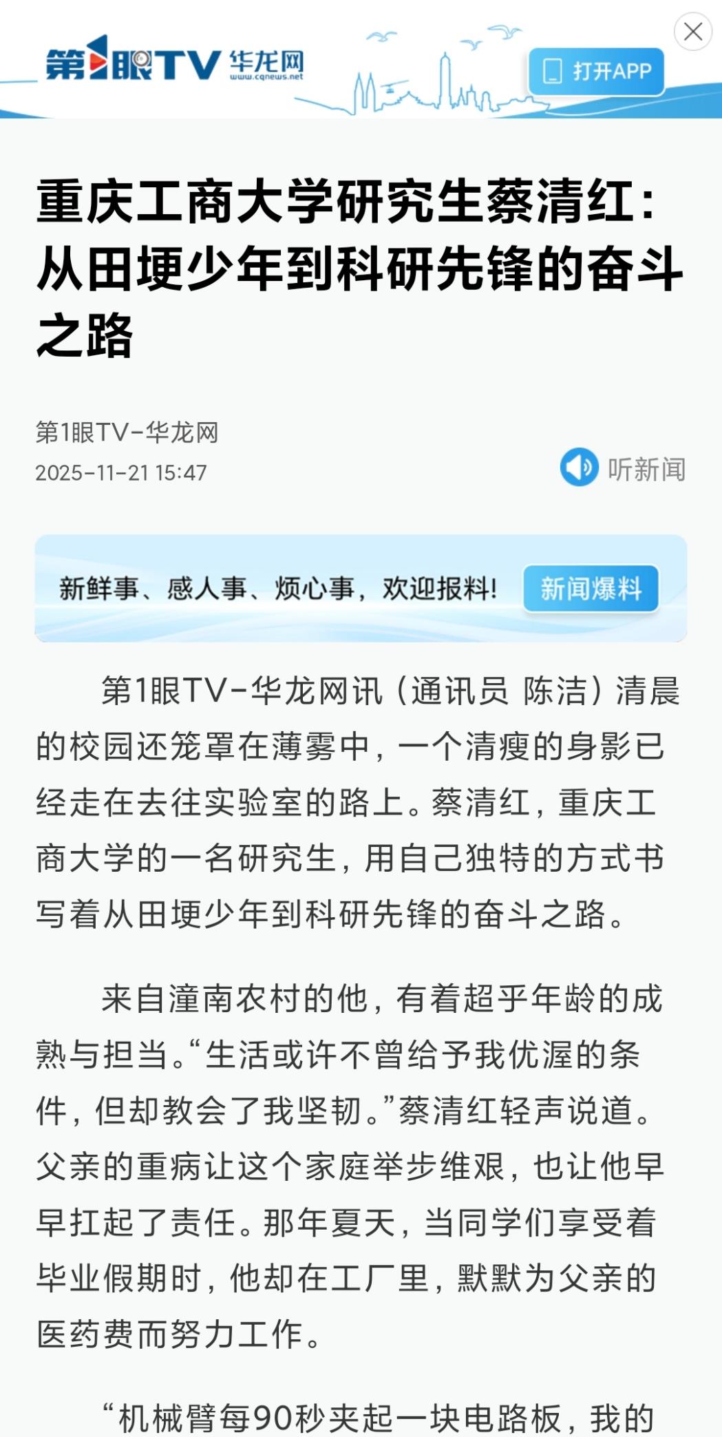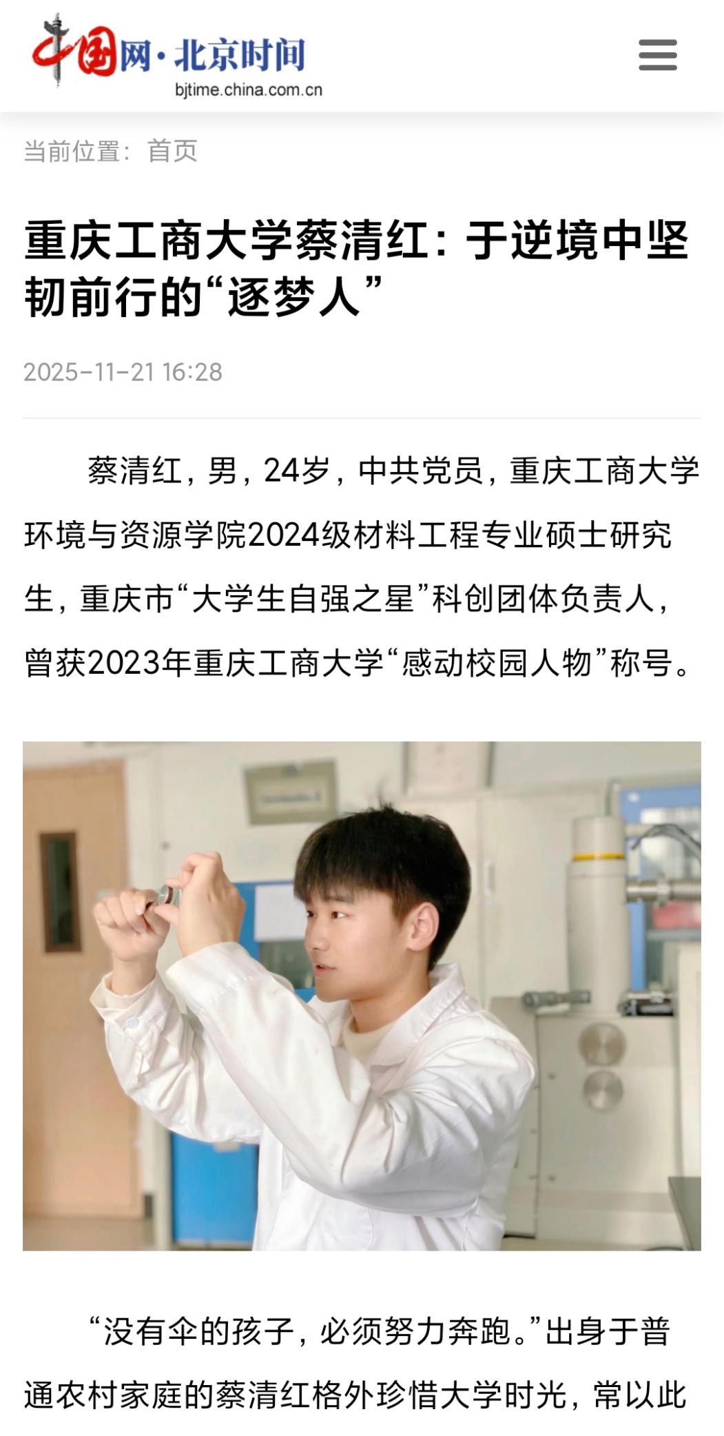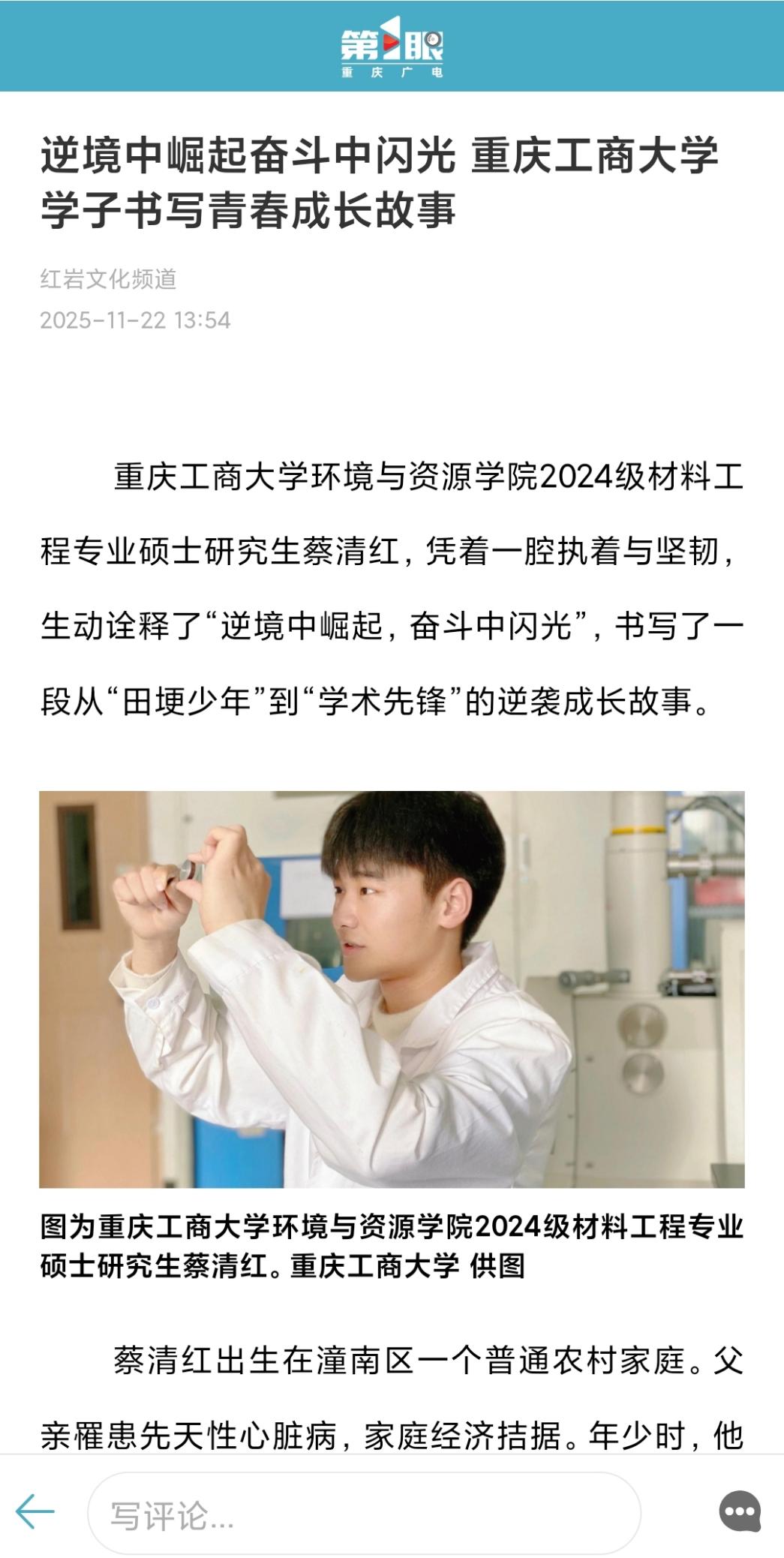 3.华龙网以《重庆工商大学研究生蔡清红:从田埂少年到科研先锋的奋斗之路》