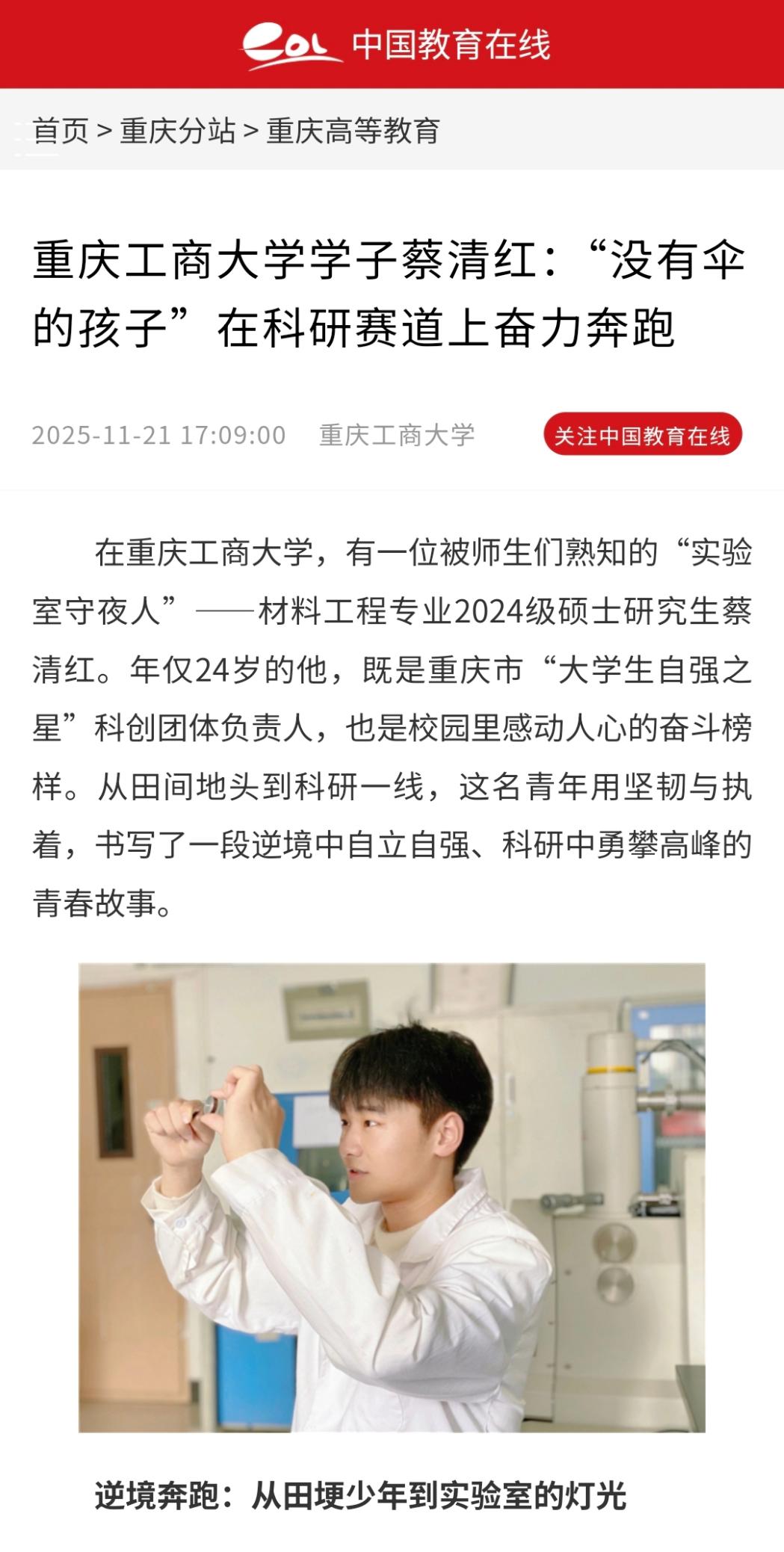 2.中国教育在线:重庆工商大学学子蔡清红:“没有伞的孩子”在科研赛道上奋力奔跑