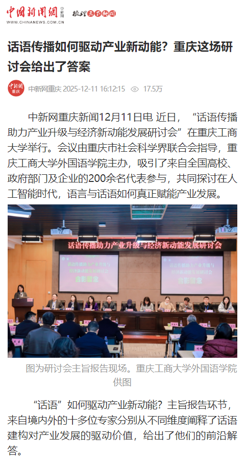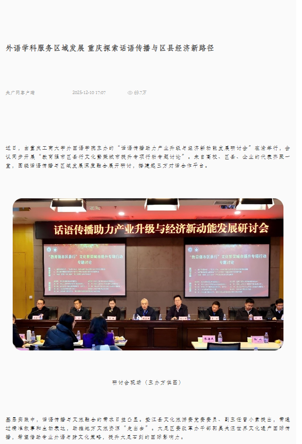 光明网以“校地协同再深化 重庆工商大学与大足区共建两大专项基地”为题,央广网以“外语学科服务区域发展 重庆探索话语传播与区县经济新路径”为题,中央广电总台国际在线以“重庆:话语传播助力产业升级与经济新动能发展研讨会举行”为题,中国新闻网以“话语传播如何驱动产业新动能?重庆这场研讨会给出了答案”为题纷纷关注报道。截至目前,相关报道的阅读量已超过91.1万人次。
