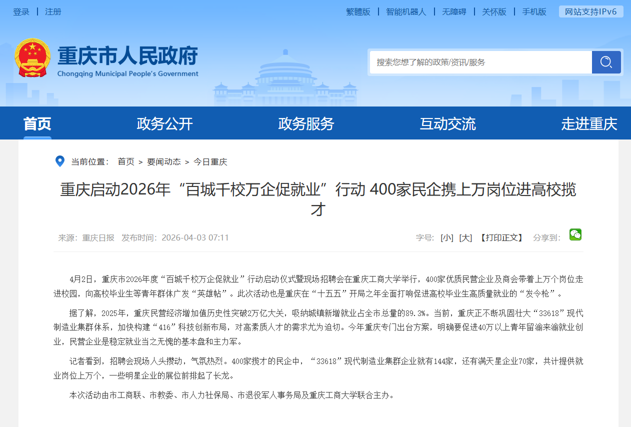 2、 重庆日报:《400家民企进校抛出“橄榄枝” 重庆启动2026年“百城千校万企促就业”行动》