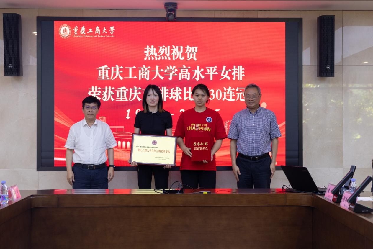 曾维伦为学校女排团队颁发“重庆工商大学青年五四奖章集体奖”。