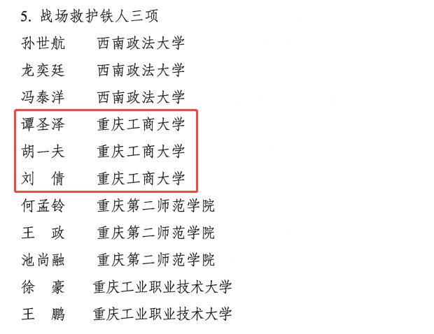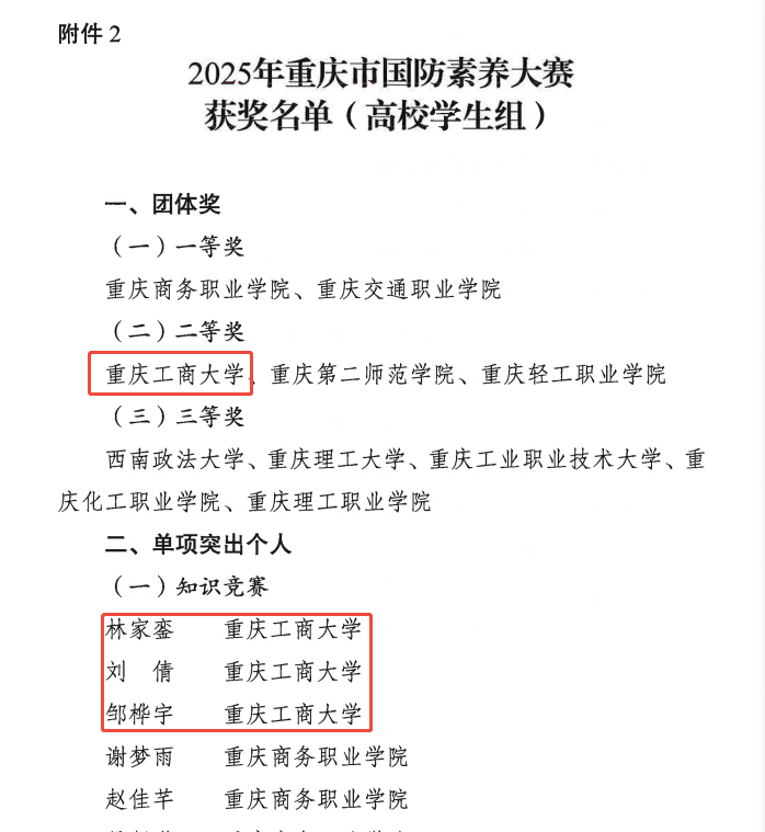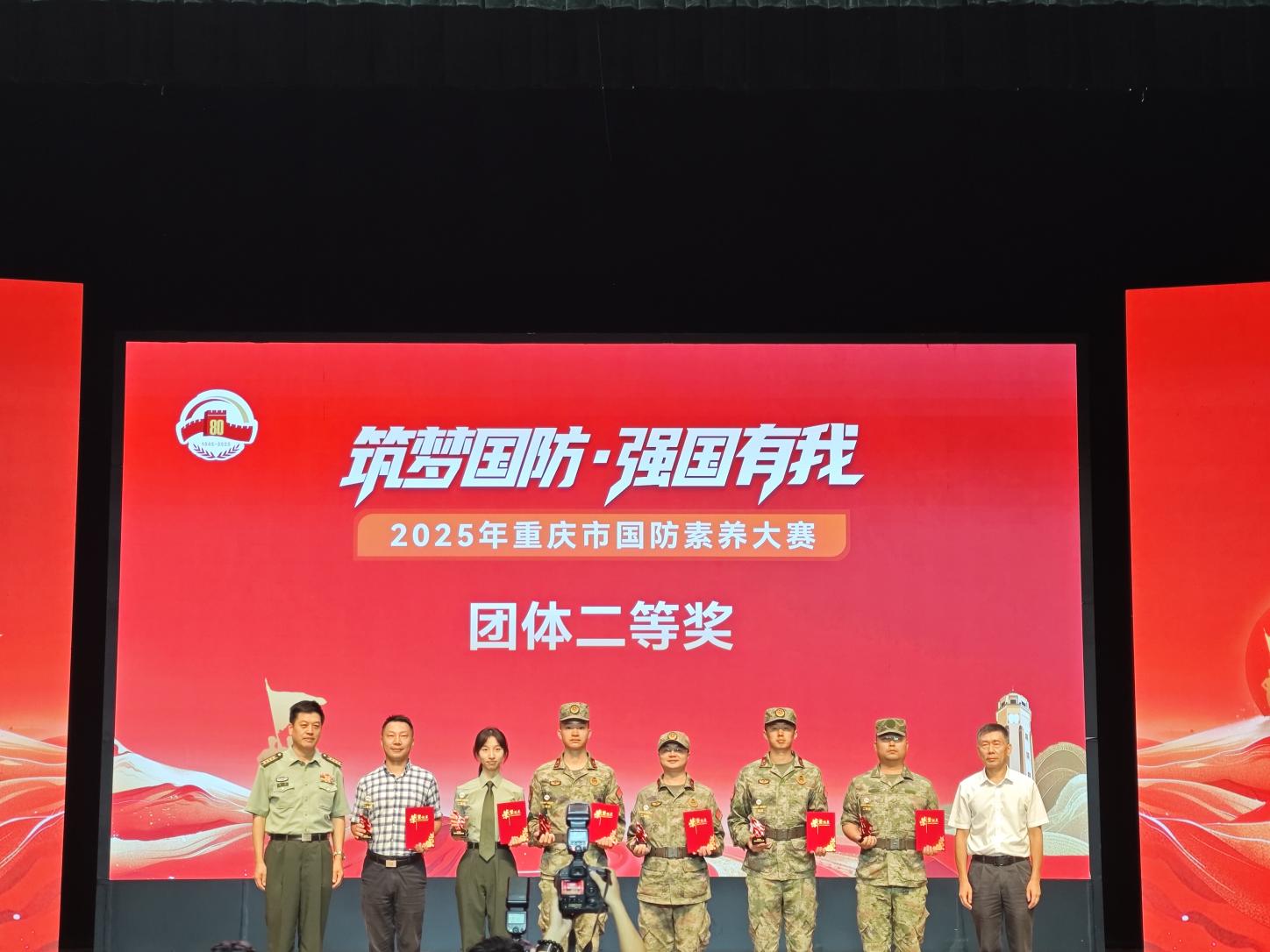 近日,中共重庆市委宣传部发文表扬在“筑梦国防・强国有我”2025 年重庆市国防素养大赛中取得佳绩的单位和个人。我校学子凭借扎实的国防知识、顽强的拼搏精神和出色的团队协作,在高校学生组竞赛中表现亮眼,获团体二等奖,6名学生获评单项突出个人。