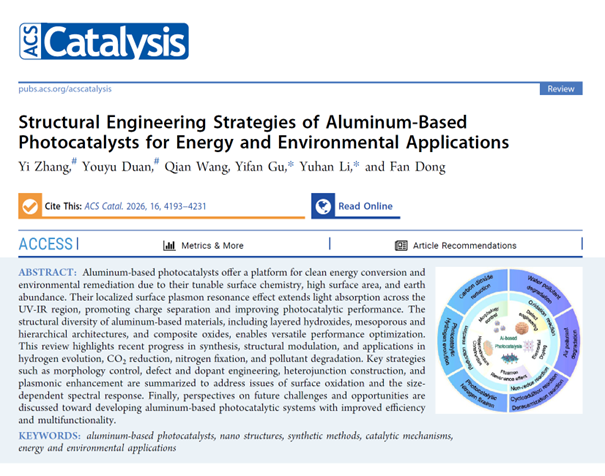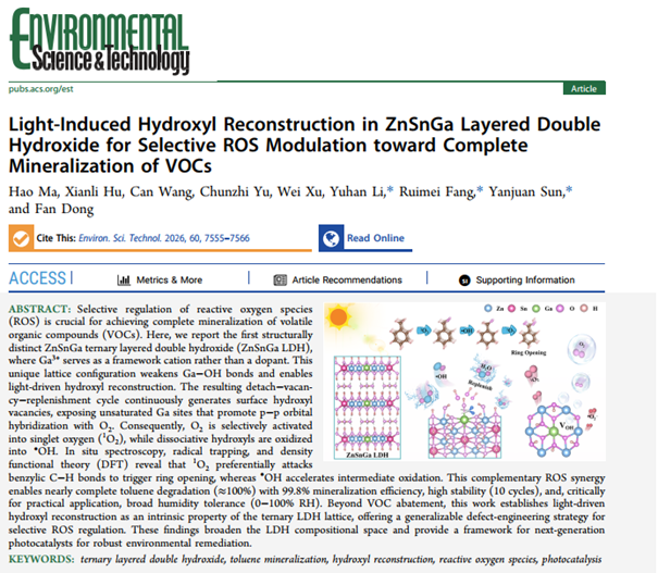近日,我校智能环境前沿交叉研究院马浩副研究员和李宇涵研究员在智能环境催化领域取得新进展。相关成果以《Light-Induced Hydroxyl Reconstruction in ZnSnGa Layered Double Hydroxide for Selective ROS Modulation toward Complete Mineralization of VOCs》《Structural Engineering Strategies of Aluminum-Based Photocatalysts for Energy and Environmental Applications》和《Decoding the atomic architecture of photocatalytic active sites: From precise identification to rational design principles》为题分别发表于环境和催化等领域知名国际期刊《Environmental Science & Technology》《ACS Catalysis》和《Chinese Journal of Catalysis》。