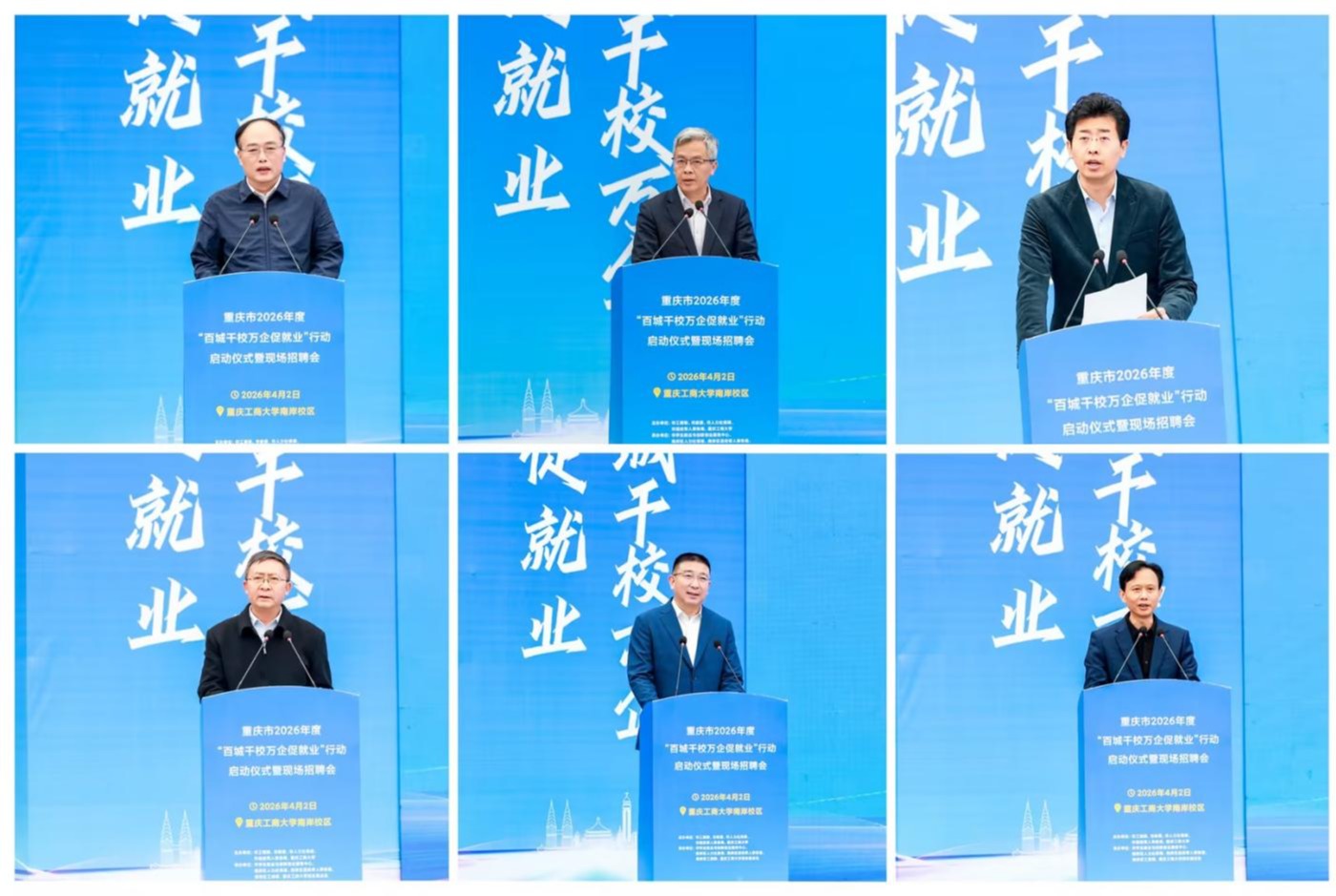 4月2日,由市工商联、市教委、市人力社保局、市退役军人事务局和重庆工商大学共同主办的重庆市2026年度“百城千校万企促就业”行动启动仪式暨现场招聘会在我校顺利举办。市委统战部副部长、市工商联党组书记施崇刚,市教委副主任栗峥,市人力社保局二级巡视员唐天元,市退役军人事务局党组成员、副局长陈军,学校党委书记曾维伦,党委常委、副校长杨柏出席启动仪式。启动仪式由市工商联党组成员、副主席蒋定平主持。