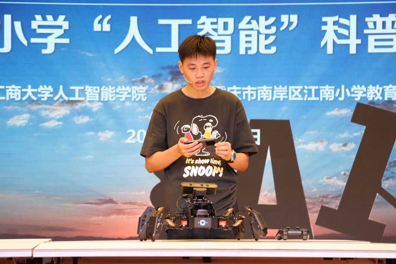 为积极响应《重庆市推进基础教育阶段人工智能教育实施方案(2025—2027年)》号召,激发青少年科技创新热情,重庆工商大学人工智能学院于2025年10月10日下午,应邀参加 江南小学“人工智能日” 特色活动,通过趣味互动与深度科普相结合的形式,为同学们开启了一场沉浸式AI探索之旅。