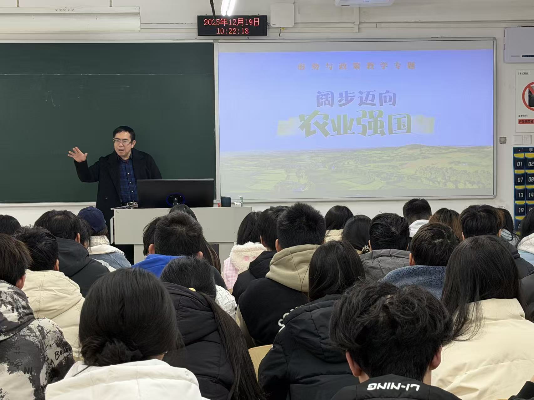 12月19日上午,我校党委常委、副校长田双全教授在博智楼07204教室为2024级城市管理专业本科生讲授形势与政策课,聚焦“阔步迈向农业强国”主题,解读我国农业现代化发展路径与新时代农业战略部署。