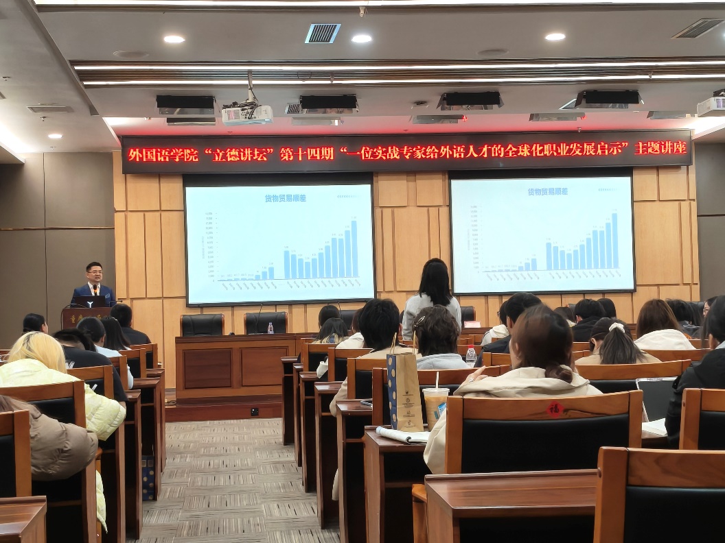 2026年3月12日下午,外国语学院结合“一站式”学生社区建设,在图书馆第一会议室举行第十四期“立德讲坛”。本期讲坛邀请我校杰出校友、拥有20余年海外工作经历、足迹遍及40余个国家的王传贤先生作题为《AI时代外语人的“元能力”觉醒与全球化出海》的主题分享,外国语学院党委副书记吴欢欢出席此次活动。作为学院学生党支部依托党员服务站打造的特色党建品牌活动,“立德讲坛”自2017年创办以来,始终秉持“立德树人”初心,致力于将思想引领触角延伸至学生社区,成为党建引领“一站式”社区建设的重要载体。