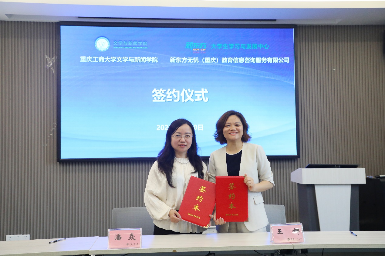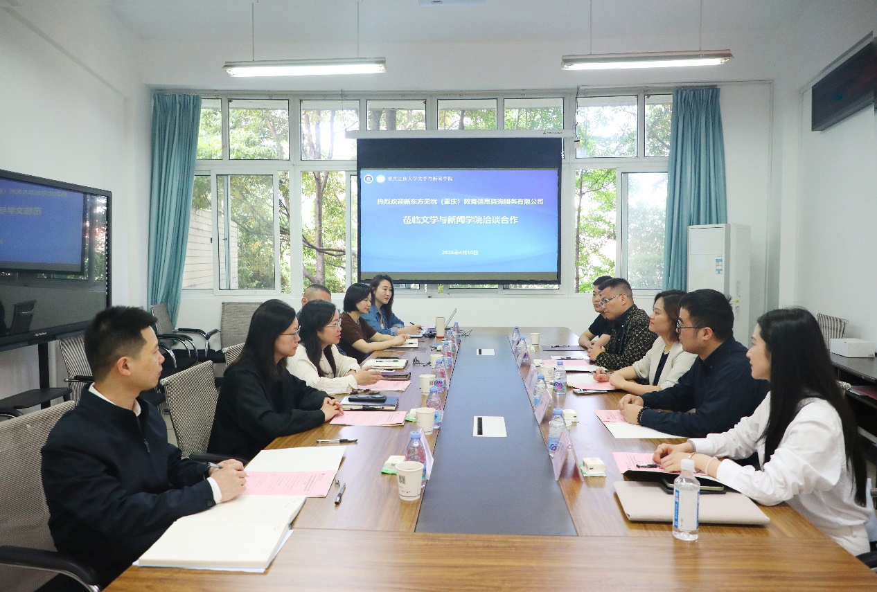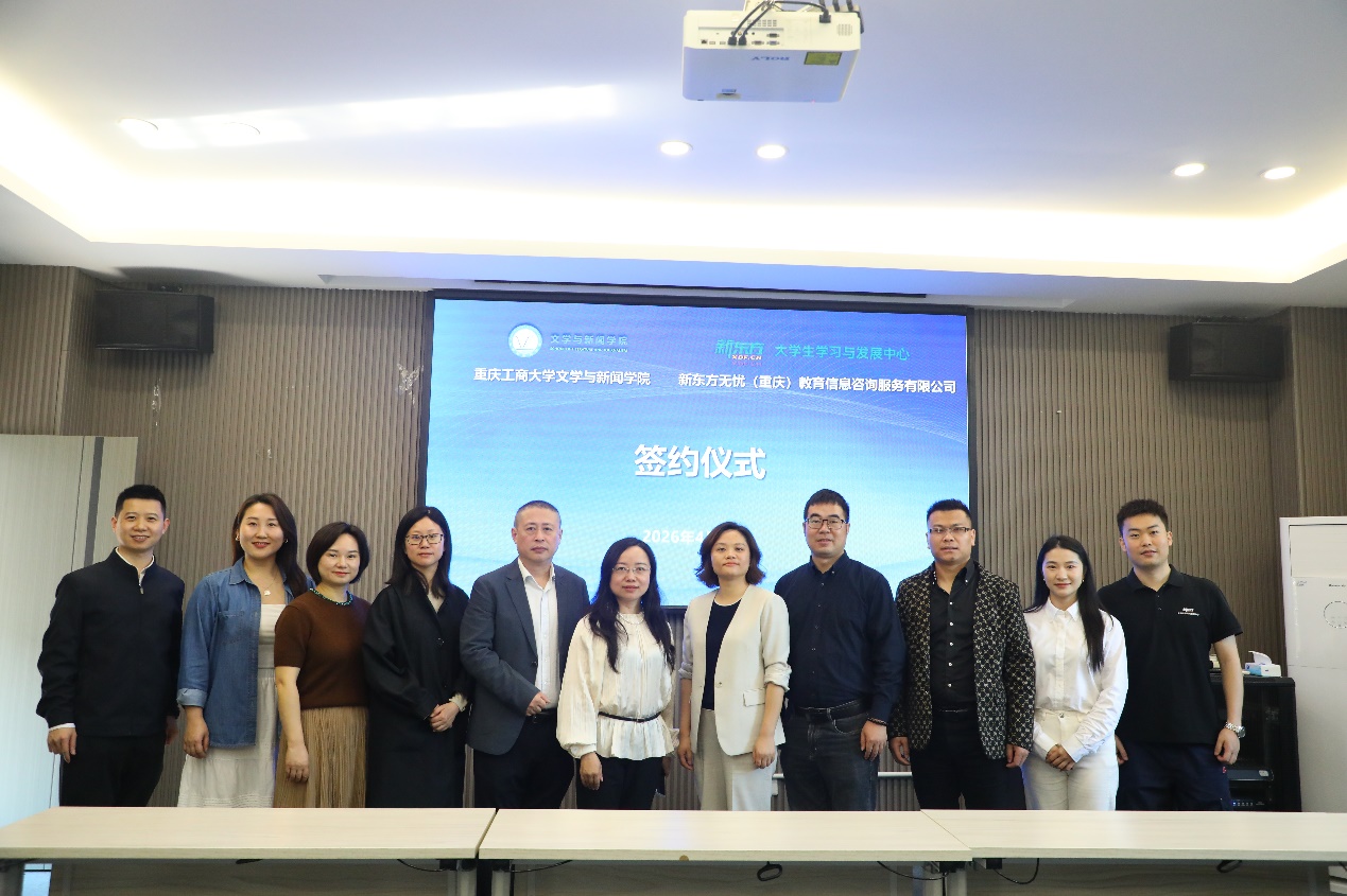 为深入贯彻落实国家关于深化产教融合、推动教育高质量发展的战略部署,4月10日上午,文学与新闻学院与新东方无忧(重庆)教育信息咨询服务有限公司在重庆工商大学慧智楼90528会议室举行校企合作签约仪式。双方将围绕全媒体人才培养、实习就业赋能等领域开展深度合作,共同服务国家文化强国与教育强国建设。新东方大学事业部重庆中心校长王娜、考研项目总监孙勇、高校公益活动负责人钟锦垚、五公里校区负责人贾舒俊、刘凡,文学与新闻学院党委书记潘焱、副书记程元元、副院长郑笑眉、学工办主任刘平,2026届就业联络员李琦、辅导员周晋、孔海啸出席了签约仪式。仪式由潘焱主持。