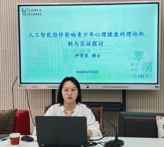 2026年4月10日,图书馆举办了第191期翠湖博士论坛。本次论坛邀请文学与新闻学院尹学琴博士作题为“人工智能陪伴影响青少年心理健康的理论机制与实证探讨”的辅导报告,全校40余名师生及校友到场聆听交流。