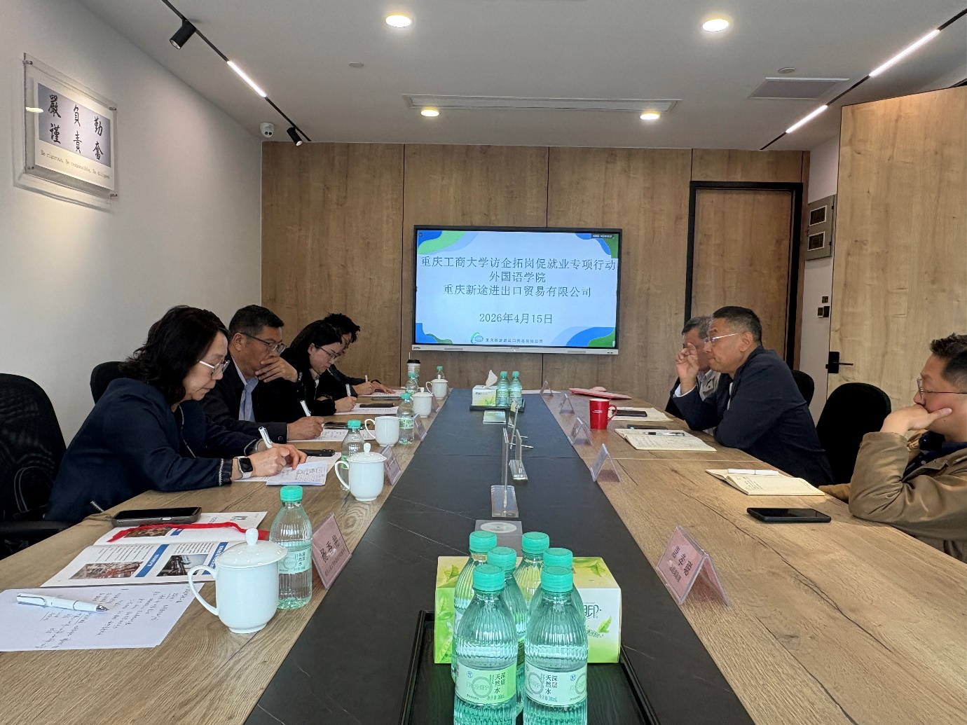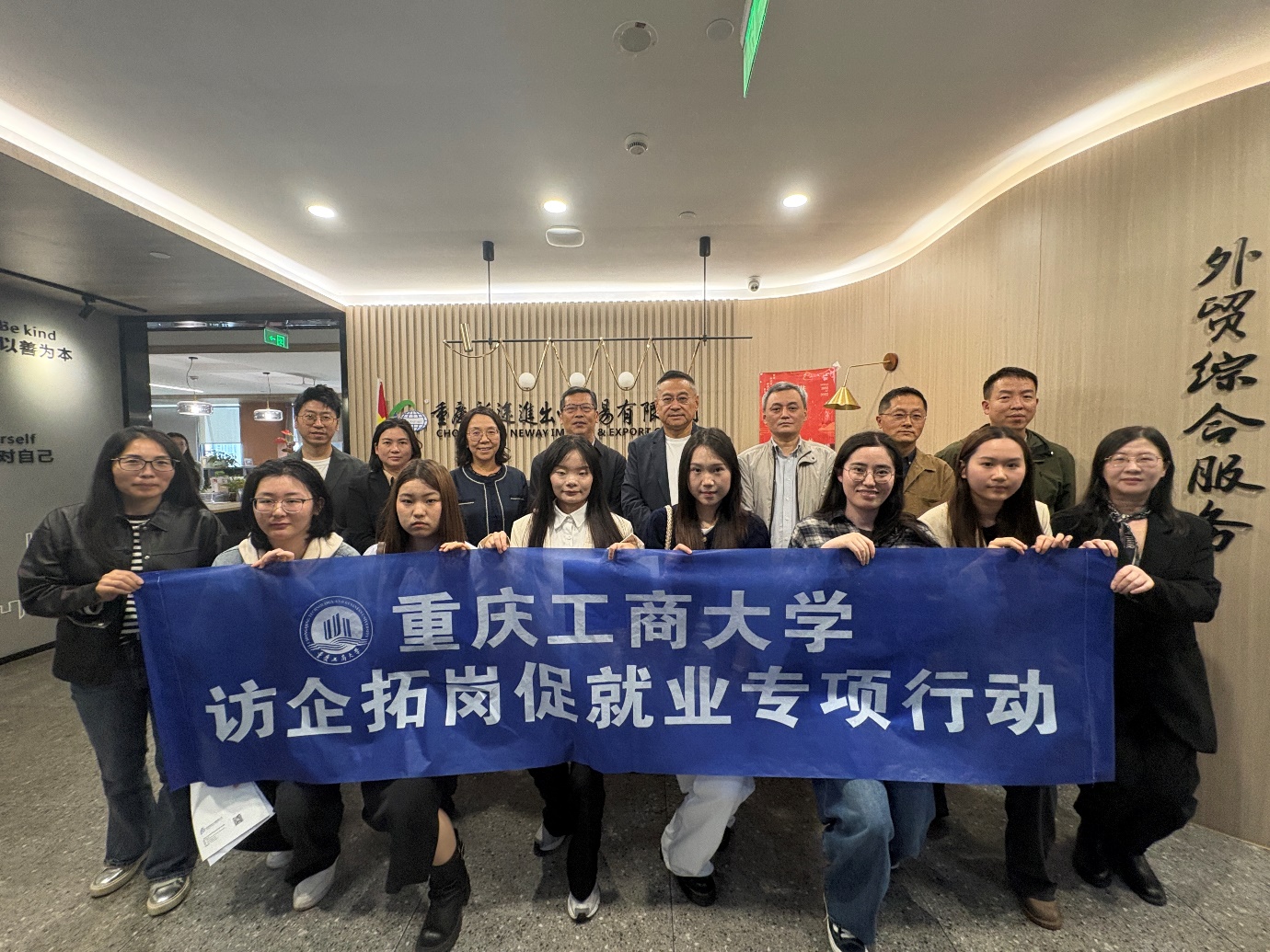 为深化校企合作、拓宽毕业生就业渠道,2026年4月15日,外国语学院党委书记彭勇、院长周琳、副院长邹莉、英语系主任助理刘勇、毕业生辅导员杨香艳及部分毕业生代表一行,走访重庆新途进出口贸易有限公司。公司董事长王敬春携各部门经理及业务负责人热情接待并参与座谈。