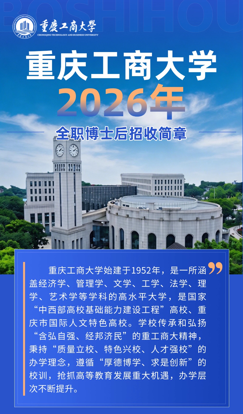 重庆工商大学2026年全职博士后招收简章