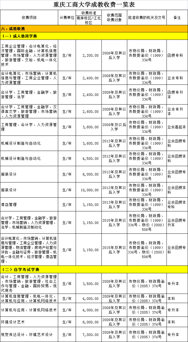 重庆工商大学2021年相关收费公示