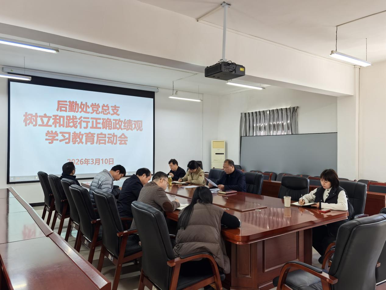2026年3月10日下午,后勤处在后勤综合楼317会议室召开树立和践行正确政绩观学习教育启动会。后勤处处领导、党总支委员、各科室负责人、各支部书记参加会议,会议由后勤处党总支副书记杜元林主持。